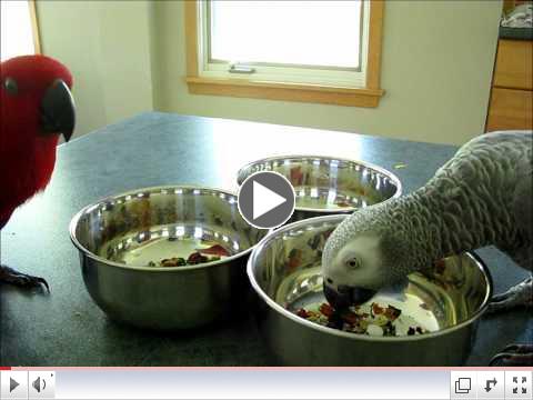 Nancy Richards has made lots of entertaining videos of her parrots. Here Dusty and Emme Jane are served their UnPellet. As Nancy says, "Dusty is being his cute grey self and Emme Jane is being her usual patient self. She knows very well that she will get one of those dishes to herself."